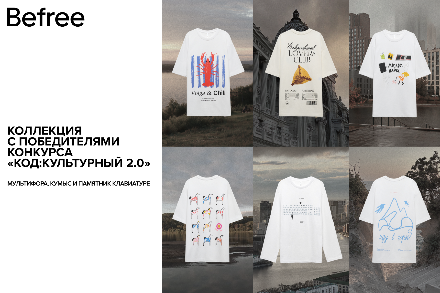 Бренд выпустил дроп футболок по итогам конкурса «КОД:КУЛЬТУРНЫЙ 2.0». На принтах победителей — локальные феномены и мемы, от татарского кумыса до сибирской мультифоры. Это наше признание в любви к родным местам, к локальным блюдам, словечкам и мемам, о которых хочется рассказать всем вокруг.